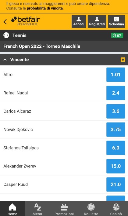Tra i bookmaker più amati nel mondo del betting in Italia, l’operatore Betfair offre un palinsesto di discipline sportive su cui piazzare scommesse, con quote estremamente competitive. Per le scommesse su l’Open di Francia ci sono i pronostici più giocati, con le quote antepost e quelle pre match come testa a testa (vincente della partita, vincente del set 1 2), under/over sul numero di game, scommesse con handicap e live.